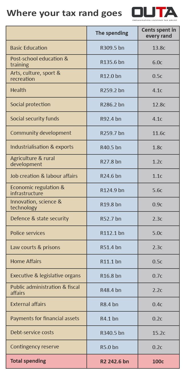 Below: Where your tax rand goes (information from National Treasury, cent-in-rand calculation by OUTA)