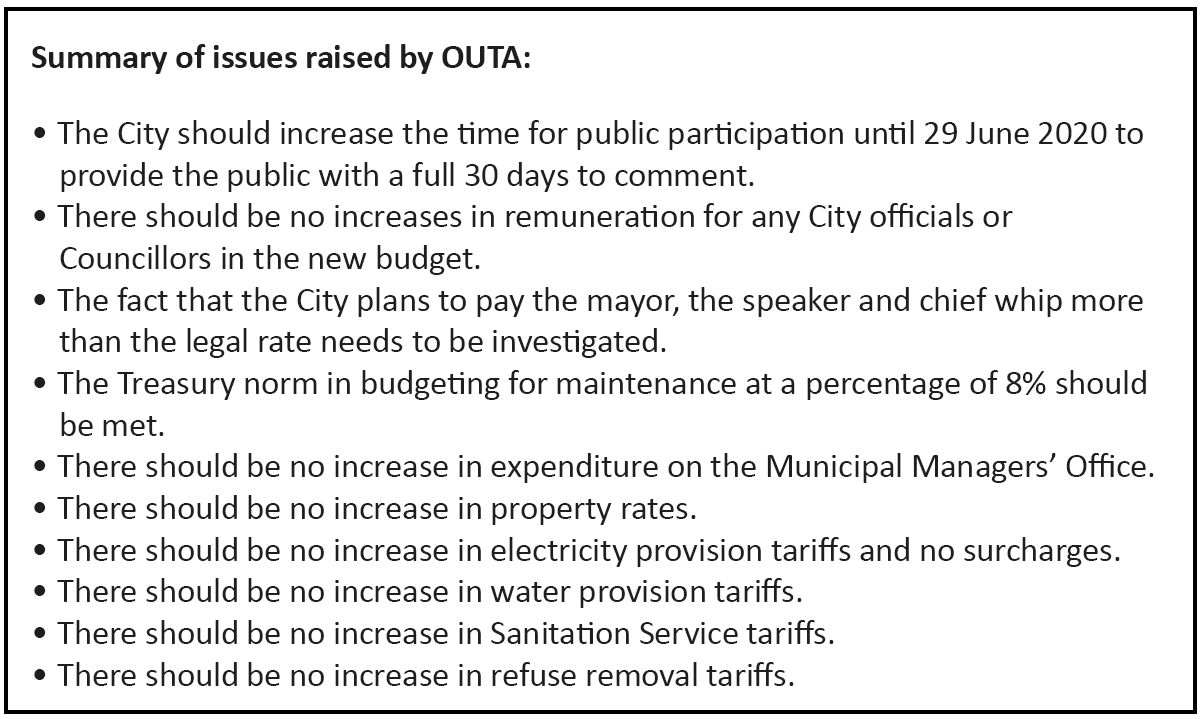 Thousands of public submissions made via the OUTA website to the COJ concerning the proposed 2020/21 draft budget, revealed overwhelmingly that city residents were against any tariff and property rates hikes, or increases in salaries for municipal staff and city councillors.