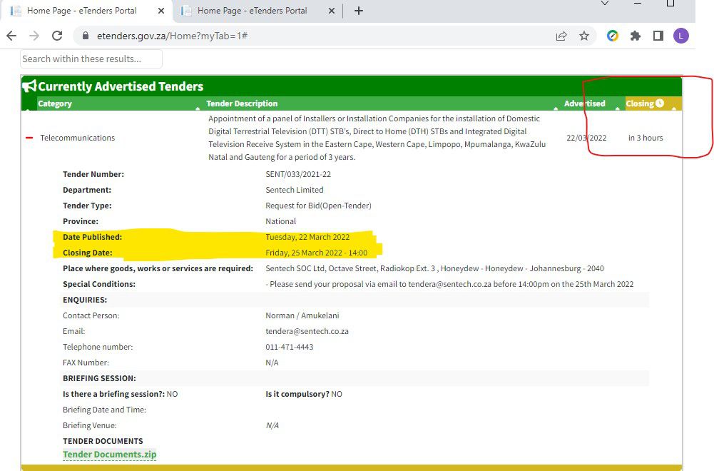 The tender is Sentech’s tender number SENT/033/2021-22 for “Appointment of a panel of installers or installation Companies for the installation of Domestic Digital Terrestrial Television (DTT) STB’s, Direct to Home (DTH) STBs and Integrated Digital Television Receive System in the Eastern Cape, Western Cape, Limpopo, Mpumalanga, KwaZulu-Natal and Gauteng for a period of 3 years.”