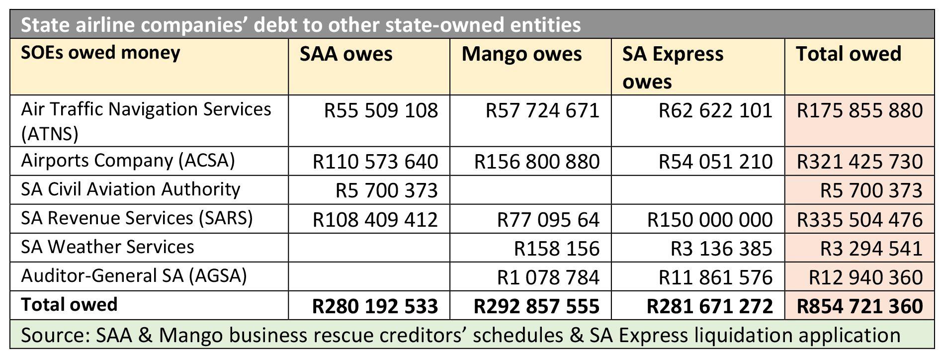 The table below (see at end of this statement) shows how the three state-owned airline companies (SAA, Mango and SA Express) were granted extraordinary credit by racking up outstanding bills to other state-owned entities, to the value of R855m. The write-off or impairment of such debt and the recapitalisation of such state-owned entities effectively implies that the unpaid debt is funded by the taxpayer. This excludes a further R718m owed to SAA Technical for aircraft maintenance, which is another SAA subsidiary that is being bailed out by the taxpayer.