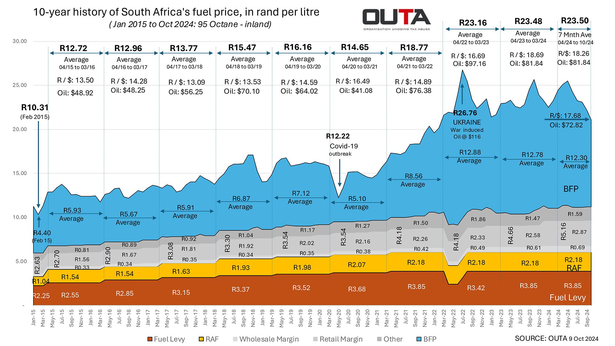 The graph also shows how the international oil price escalations that began in 2021/22, taking Brent Crude from $65 to $96 per barrel (average $76.38 for that year), pushed our petrol price over R20 per litre and have kept our petrol prices fluctuating on average per year above the R23 per litre mark since then.