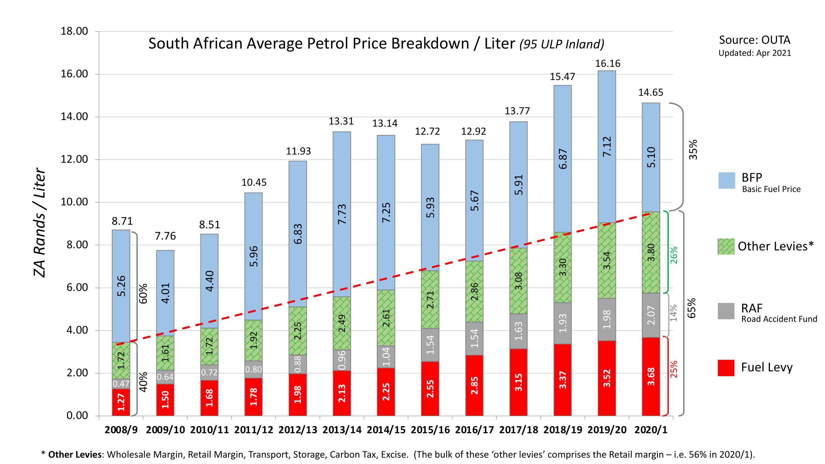 The Road Accident Fund (RAF), which in 2009 made up 5% of the price of petrol and generated around R9bn per annum for vehicle related injury compensation, now makes up for 14% of the fuel price and pumps around R45 billion into the RAF. This specific ‘tax’ has undergone a number of substantive increases (from R0.45c per litre in 2009 to R2.18 in April 2021), in order to keep pace with the growing demand on these lucrative revenues which are largely wasted due to inefficient administration, corruption and unscrupulous legal claims which the RAF administrators are too weak to challenge.