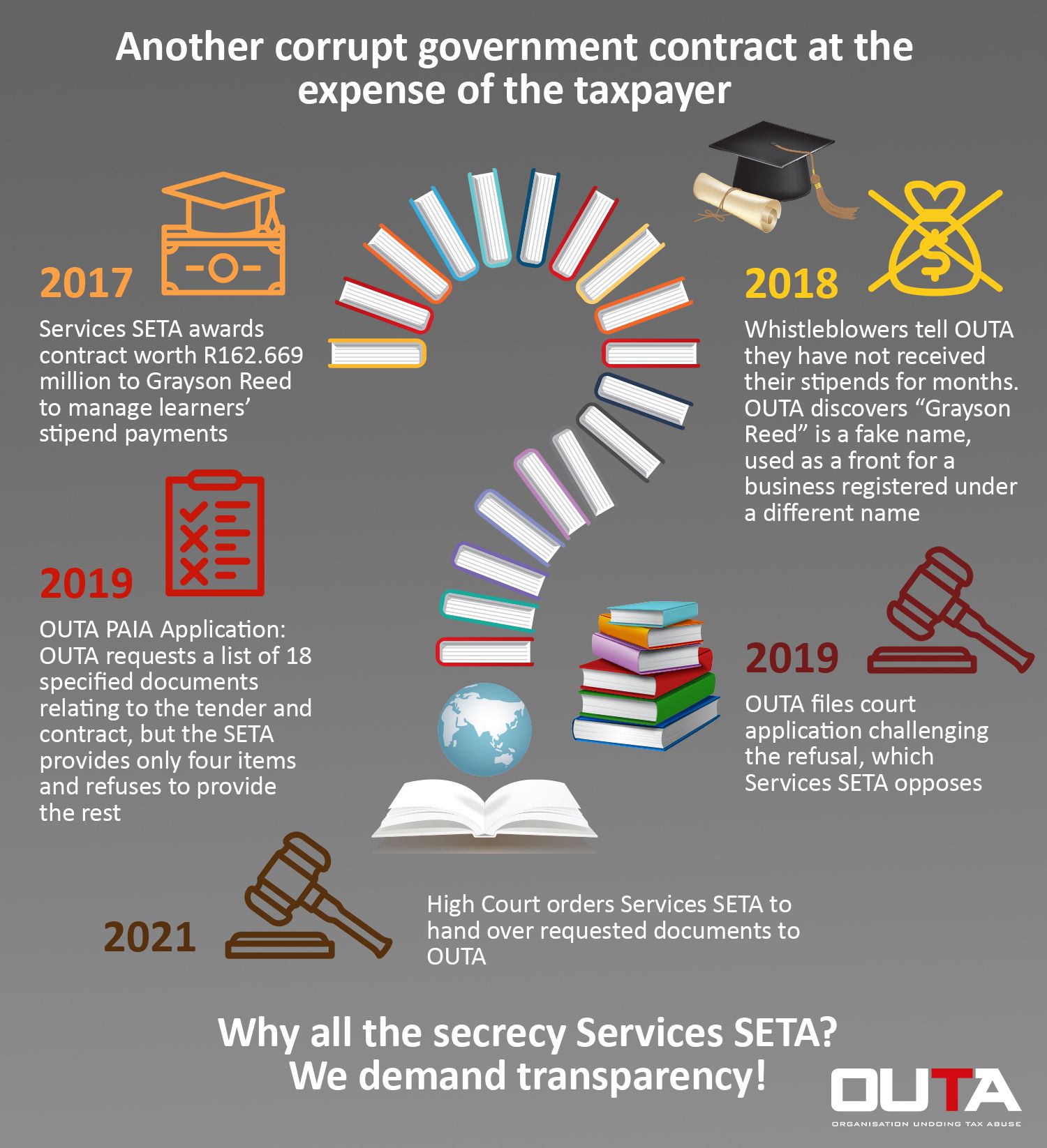 On 23 January 2019, OUTA filed an application in terms of the Promotion of Access to Information Act (PAIA) with the Services SETA, asking for a specified list of documents relating to a controversial contract worth R162.669 million with a business called Grayson Reed. The Services SETA had hired Grayson Reed to manage stipend payments to learners and interns on work experience postings, and manage a biometric learner attendance monitoring system. Learners approached OUTA saying they had not received their stipends for months, and were unaware of any biometric devices being used. OUTA had exposed the existence and failure of the Grayson Reed contract in November 2018.