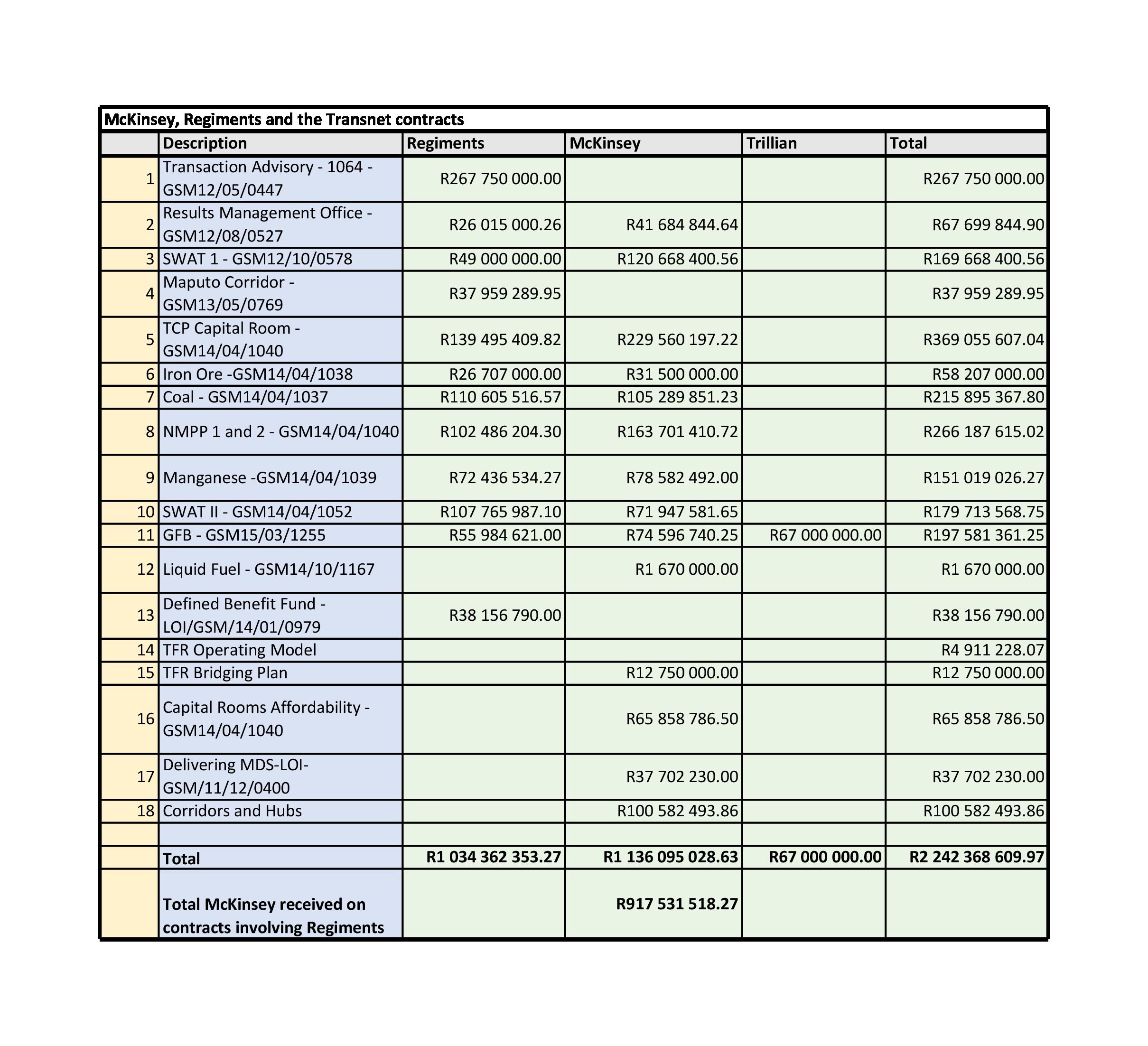 The table below shows the contracts and payments received by McKinsey, Regiments and Trillian on “services” delivered to Transnet. OUTA believes that these are the amounts – plus interest – which should be repaid to Transnet.