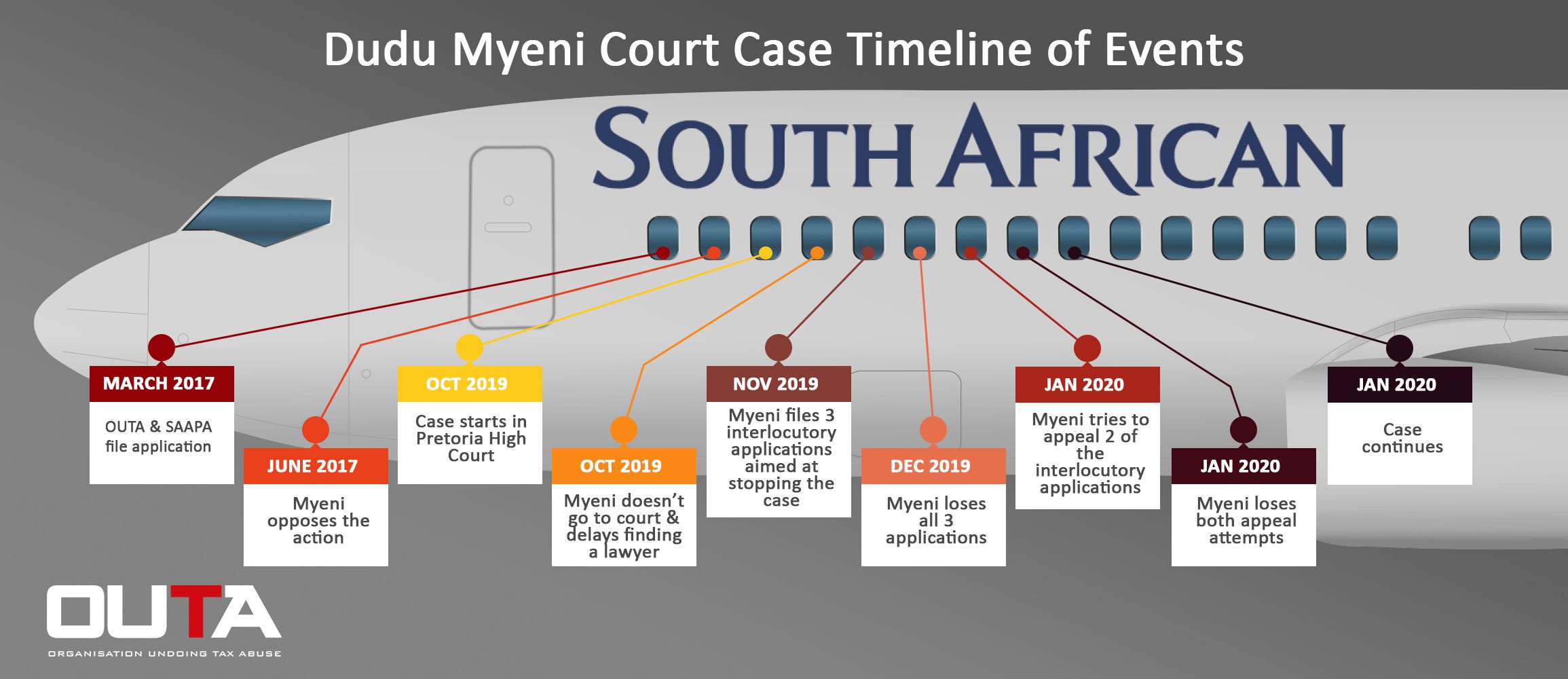 These appeals were against two of the three interlocutory applications which Myeni brought in November 2019 and lost the following month. The three applications were: to challenge OUTA's legal standing to bring the case; to amend her original plea; and to join other former SAA directors to the case.