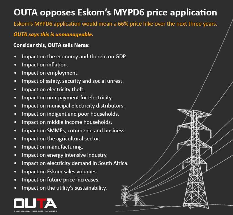 Today OUTA is at the National Energy Regulator of SA (Nersa) public hearings in Midrand, objecting to Eskom’s application for price increases over the next three years.