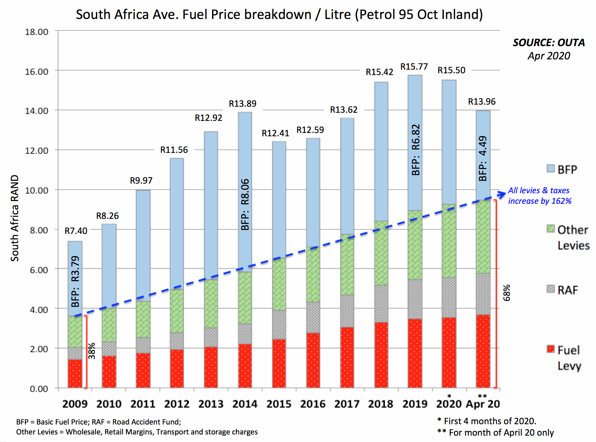 The various taxes and levies which make up the “non-fuel” related costs, comprise of the Fuel Levy (FL), Road Accident Fund (RAF), Wholesale and Retail Margins plus a few other smaller transport and storage charges. In 2009, the combined value of these charges amounted to R3.61 or 49% of the total fuel price. Today, that figure has risen to R9.48 and makes up 68% of the fuel price in April 2020.