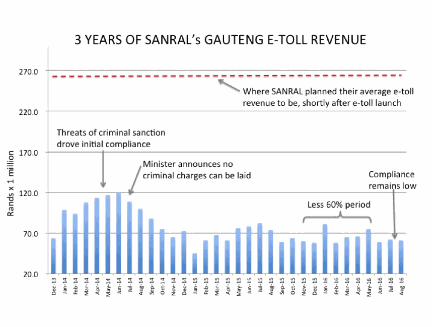 “At best and only after a multi-million rand marketing campaign which threatened motorists with criminal records, the scheme was able to achieve around 40% compliance levels at R120m per month by mid 2014. Today, that level has dropped to below 18% and around R60m per month.”